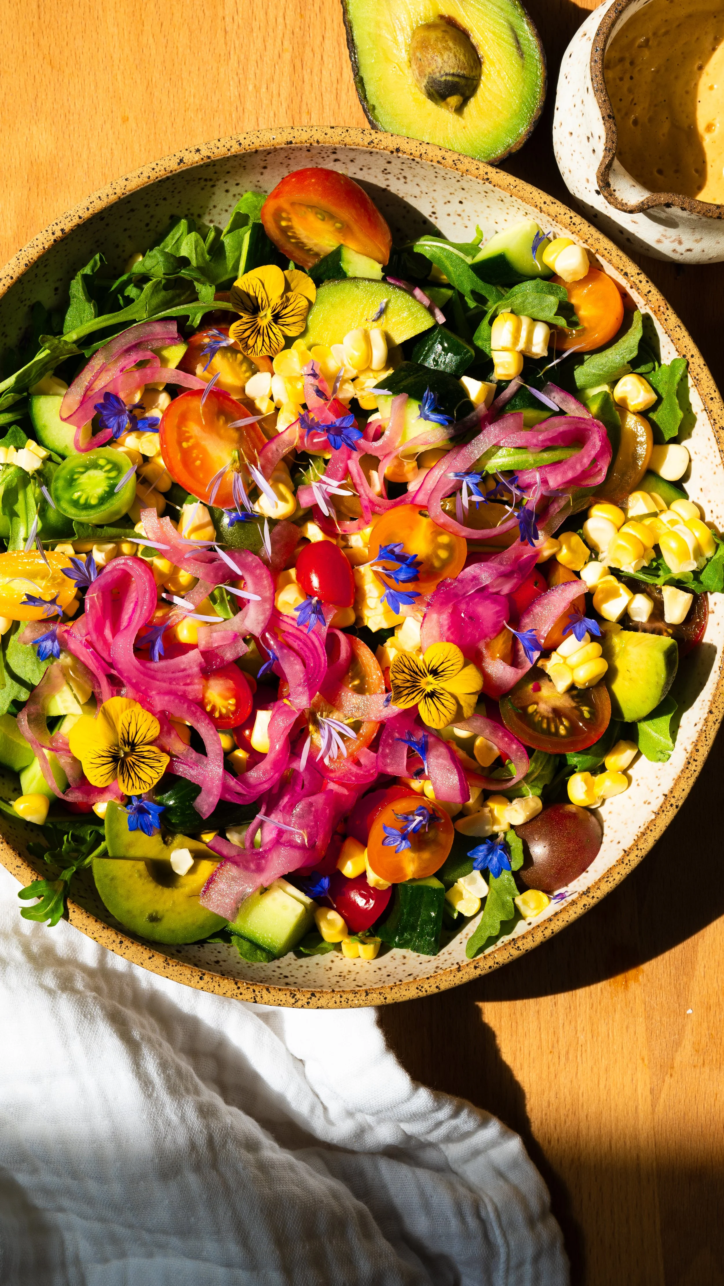 raw sweet corn, sun gold & seasonal cherry tomatoes, Persian cucumber, arugula, raw quick pickled red onion, gochugaru tahini dressing